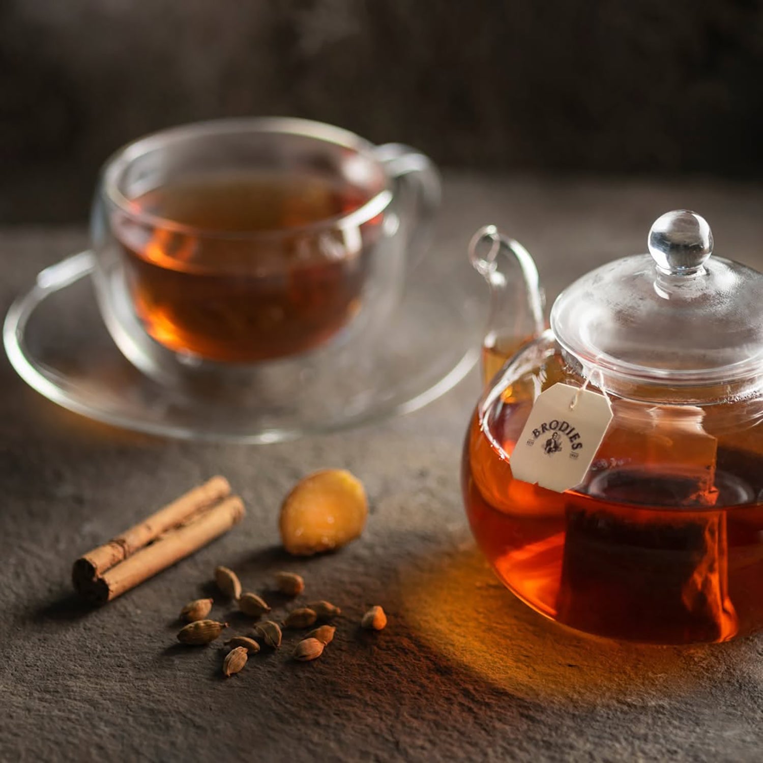 Brodies Chai Masala Tea is a flavorful blend of premium black tea and traditional Indian spices. This aromatic tea combines bold black tea leaves with ginger, cinnamon, cardamom, clove, anise, and black pepper to create a rich, warming beverage.